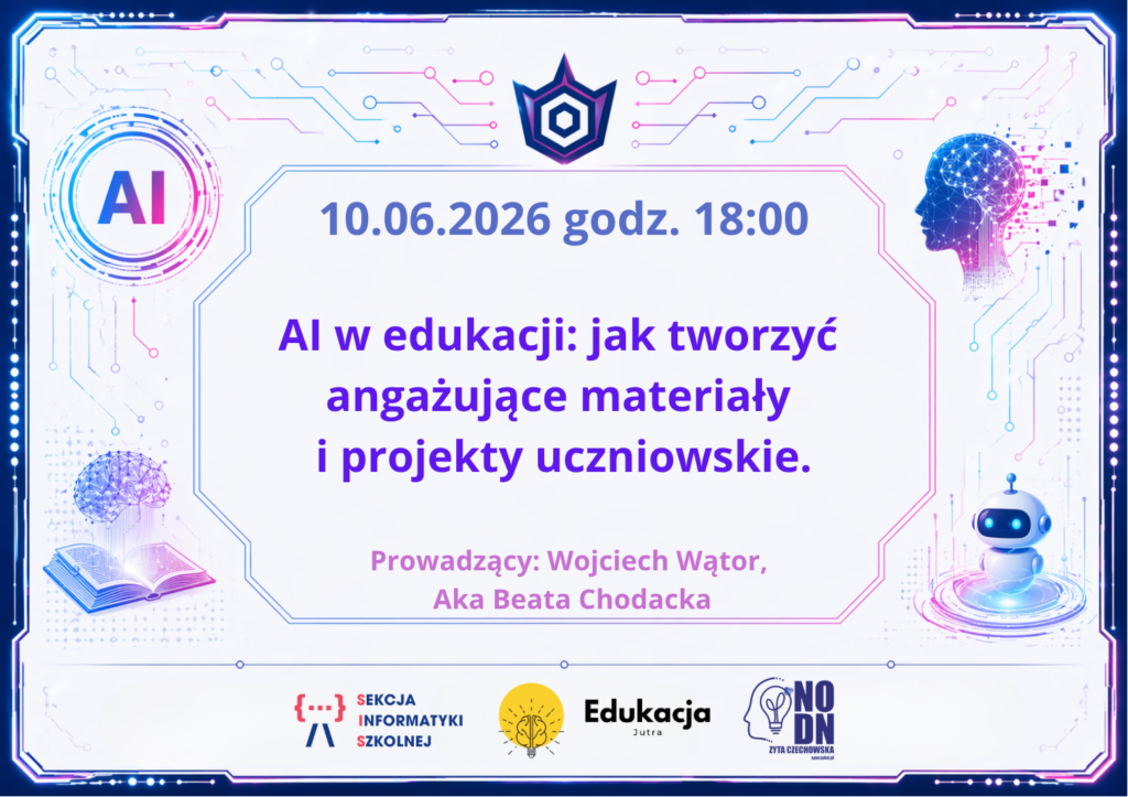 W ramach wyróżnienia wszyscy opiekunowie otrzymali zaproszenie na warsztaty on-line przygotowane we współpracy z NODN Zyta Czechowska pt. „AI w edukacji: jak tworzyć angażujące materiały i projekty uczniowskie”. Szkolenie poprowadzą Wojciech Wątor (Edukacja Jutra) oraz Beata Chodacka (Sekcja Informatyki Szkolnej, PTI)